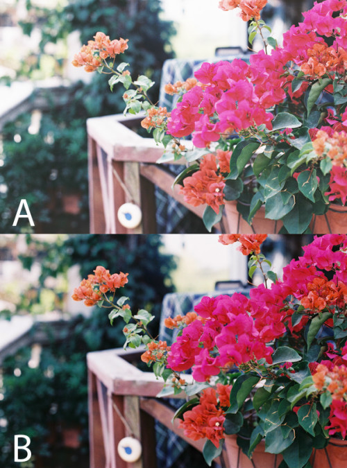 最終掃描出圖,使用普通顯示器觀看A圖色彩較淡,顆粒粗,類小清新的風格。表面上會讓人覺得圖像細節豐富。但其實暗部發灰,亮部顯白,色彩薄弱。如使用 100% sRGB 顯示器或 92% Adobe RGB 觀看效果整體發灰。